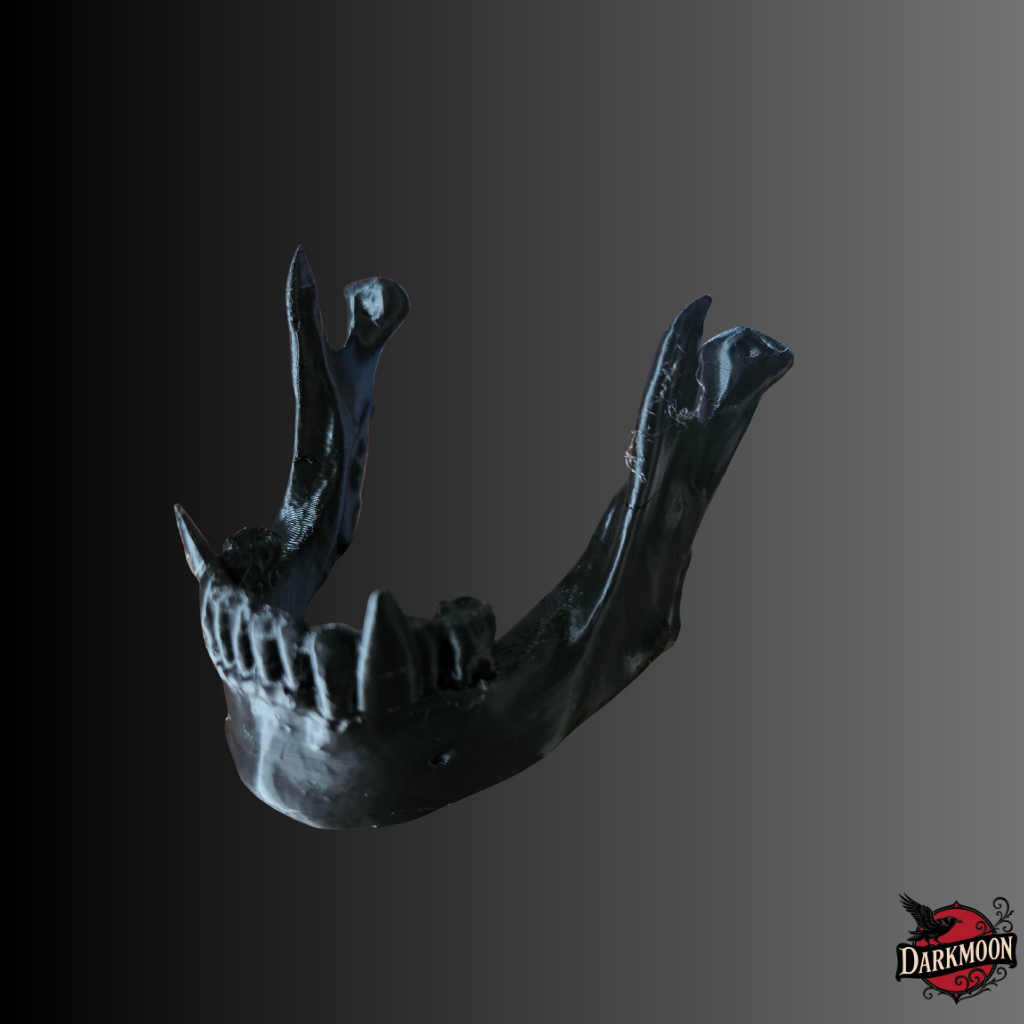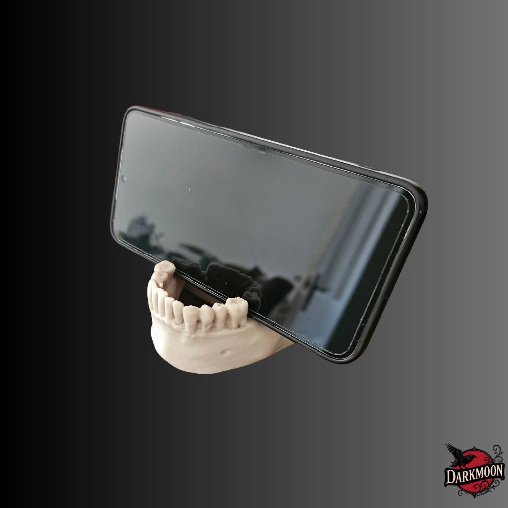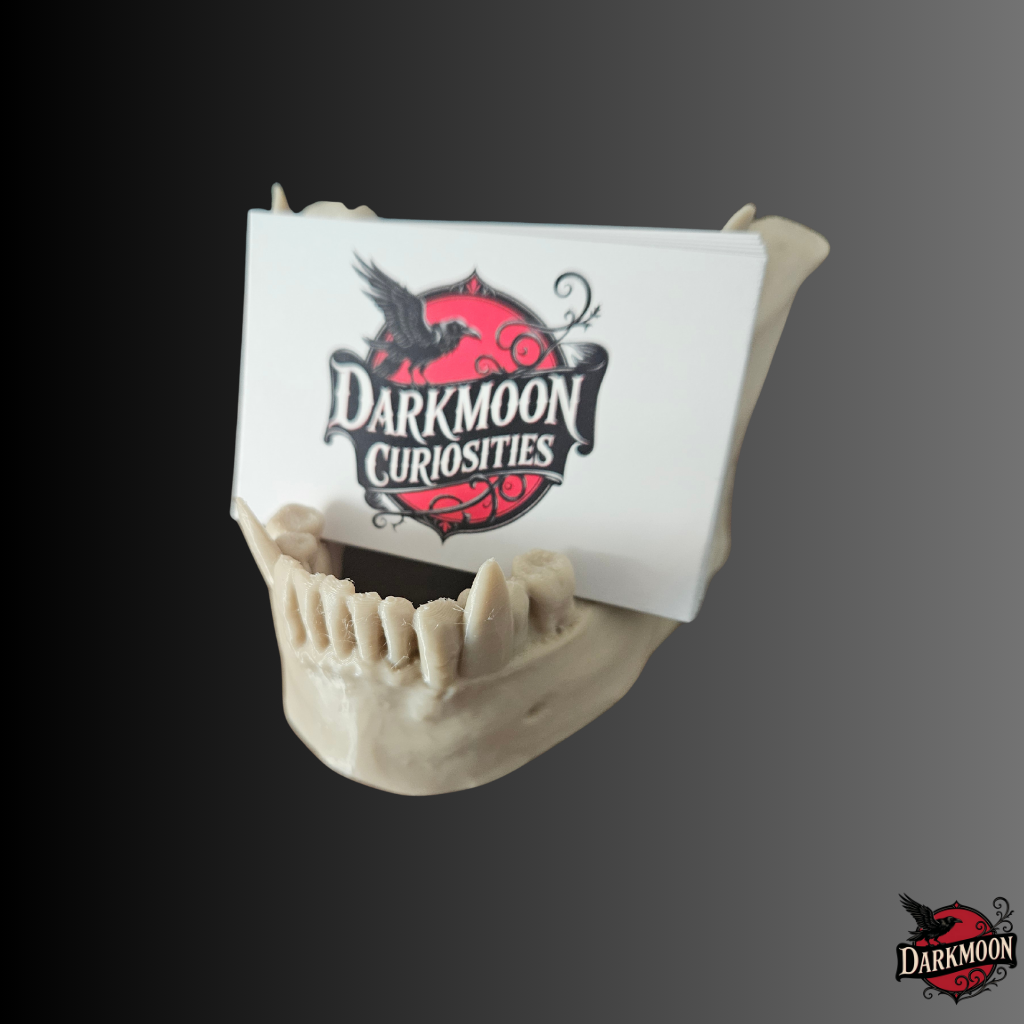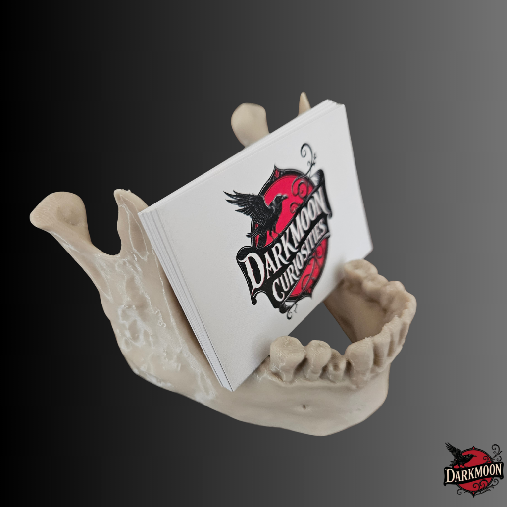 A detailed 3D-printed lower-jaw sculpt that functions as both a phone stand and a business card holder. Available in black, bone, or hand-painted bronze with varnish.