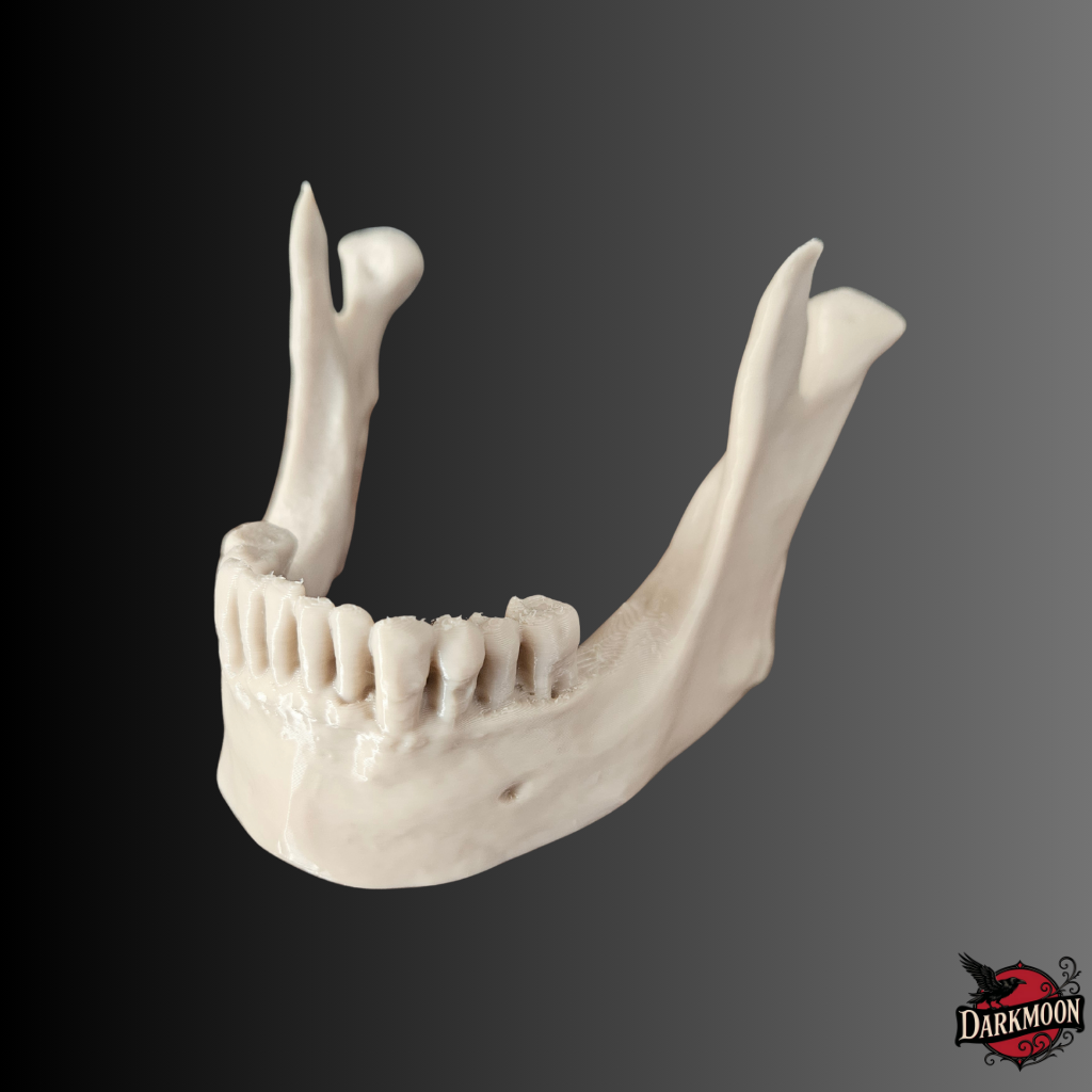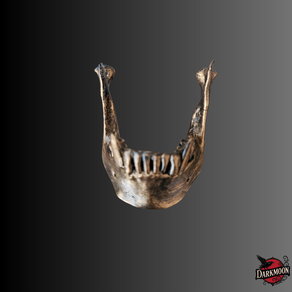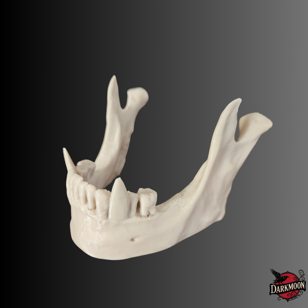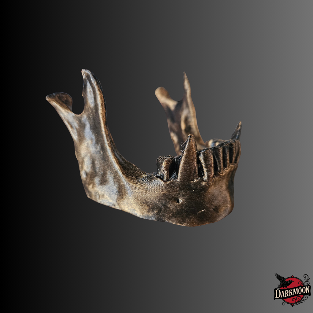 A detailed 3D-printed lower-jaw sculpt that functions as both a phone stand and a business card holder. Available in black, bone, or hand-painted bronze with varnish.