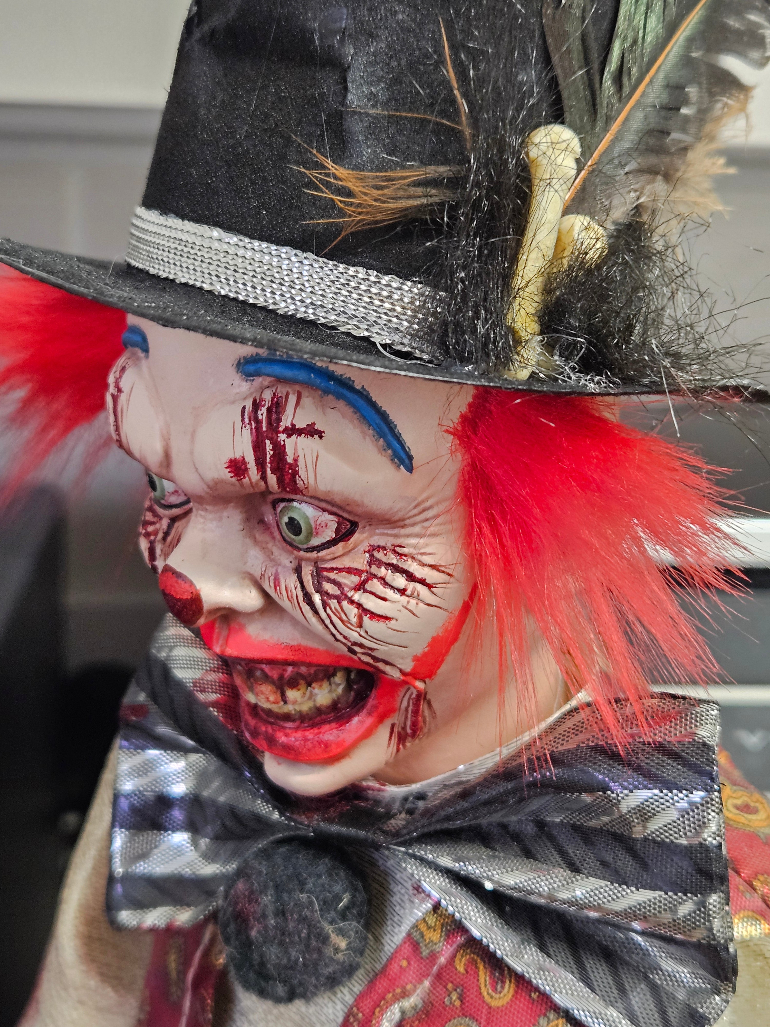 Jeffrey’s original porcelain head has been replaced with a custom 3D-printed monstrosity—wide, bloodshot eyes, a snarl that suggests he’s overheard every dark thought you’ve ever had, and face paint that’s seen far too many midnights. Nestled somewhere behind that grin is an ancient demon who found the accommodation acceptable and decided to stay. He’s not supernatural himself—no shapeshifting, no balloons, no sewer-dwelling theatrics—but the tenant inside him has a habit of whispering instructions.