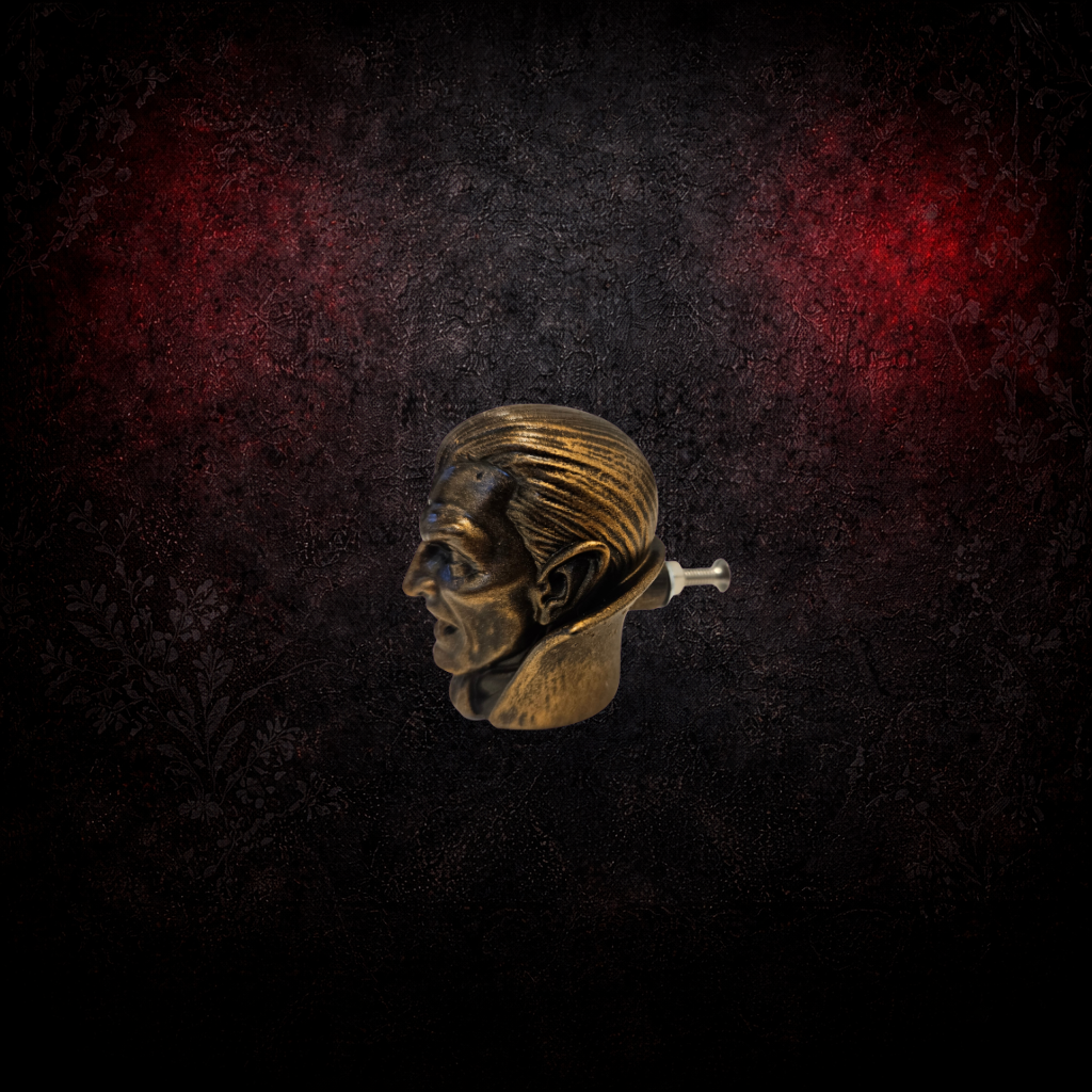 Made with resin and hand painted in a rich antique bronze finish, the design highlights the sharp features and classic vampire expression. A distinctive piece of gothic hardware for alternative interiors, horror lovers, or anyone looking to give their furniture a darker personality.